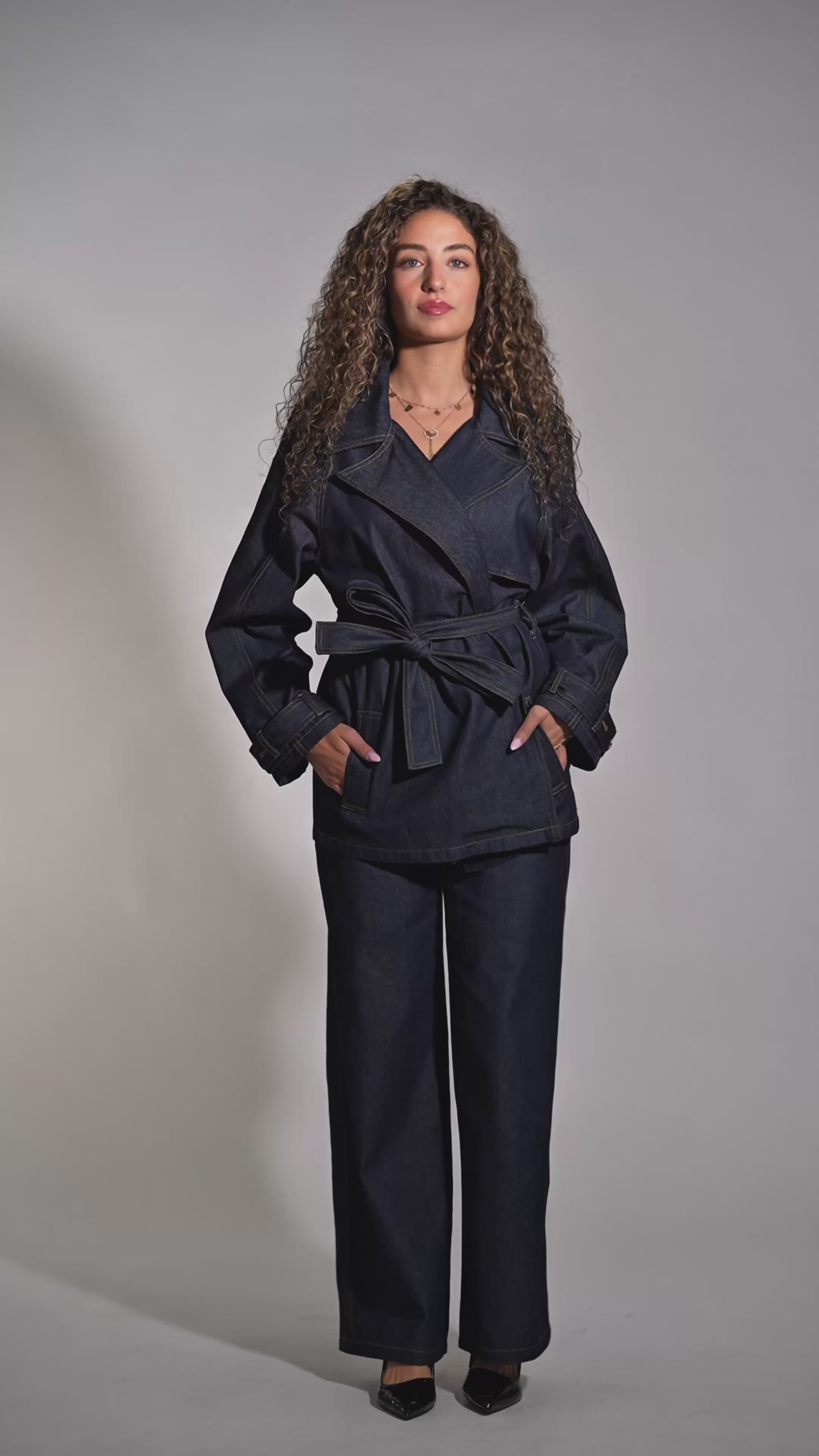 Complément idéal du pantalon en jean , cette veste en jean de haute qualité allie style décontracté, détails raffinés et élégance urbaine. Sa coupe cintrée est sublimée par la ceinture, créant une silhouette flatteuse. Les surpiqûres marron apportent un contraste chaleureux et harmonieux au denim, tandis que les boutons dorés confèrent à l'ensemble une touche luxueuse et élégante. Des poches fonctionnelles offrent une élégance pratique, et les poignets ajustables par bouton complètent ce look stylé.