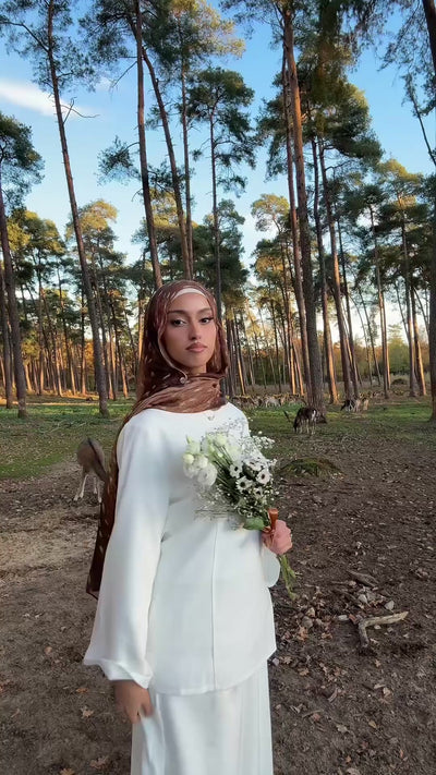 Une touche de noblesse viennoise revisitée : cet ensemble en lin raffiné allie une élégance intemporelle à une légèreté luxueuse. Le corsage, aux manches trompette fluides et à la délicate fermeture à nouer dans le dos, flatte la silhouette, tandis que la jupe assortie se distingue par ses lignes épurées et son raffinement discret. Un ensemble pour une présence affirmée, inspiré par la splendeur de la ville impériale.